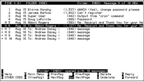 Pine also allows mail to be organized into folders to help organize your mail: